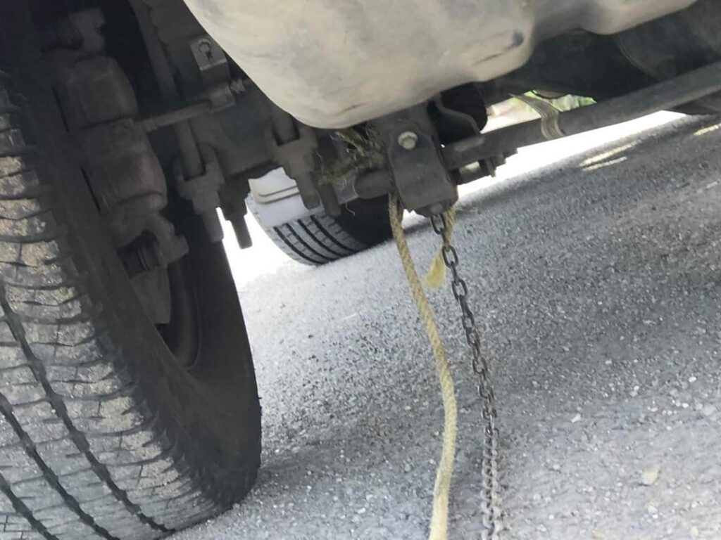 Después de gritarles y hacerles señas para que detuvieran su marcha, los custodios se bajaron y fueron a ver la zona de rodaduras de las llantas traseras donde se encontraba el animalito amarrado con un laso.